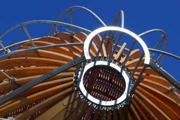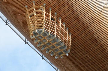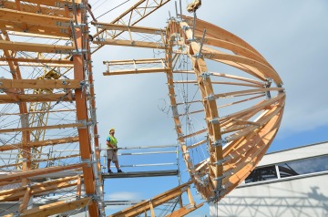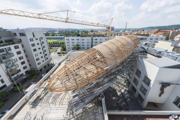 structure above the DOX Centre's modern architecture for several years. In 2013 he contacted internationally renowned architect Martin Rajniš, and for more than two years, they and experts on wooden structures and steel worked on the design of a huge architectural intervention inspired by the shapes of the huge airships from the early twentieth century.