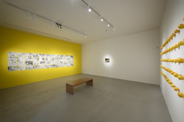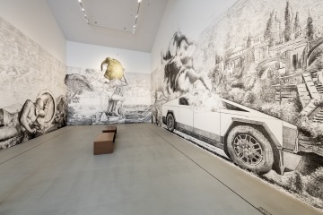 In the large new work Out of Chaos (2024–25), Martinec creates a tableau in which a tabletop still life (featuring the Northern European painterly trope of the “lemon twist”) opens onto a visual quotation from Arnold Böcklin’s iconic Isle of the Dead (1880–86, versions in the Kunstmuseum Basel, the Metropolitan Museum of Art in New York, and elsewhere). In this hybrid work and others Martinec explores the relationship between painting and drawing by leaving areas of the canvas unpainted, revealing the charcoal underdrawing, and working some drawn elements up to a high degree of finish. In DOX’s top-floor space, Martinec has further developed this recent aspect of his practice by installing large-scale site-specific wall drawings. The culmination of the exhibition is a representation of the mythic figure of Atlas, derived from a sculpture in the museum in Naples, who bears upon his shoulders not the globe but a giant lemon.