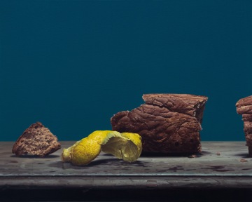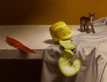 Often labelled hyper- or photorealist, Hynek Martinec’s paintings defy such categorisation. While his painterly technique is rooted in the realist tradition, he collapses together imagery from diverse sources, creates surreal juxtapositions, and distorts form and scale to create complex images that elude simple interpretation. In his new work, his references include ancient Greek and Roman sculpture, paintings by Rubens and Titian, the tradition of Dutch still-life painting, Damien Hirst’s diamond-encrusted skull, and Tesla’s cybertruck. Running through many of the paintings in the exhibition is the motif of the lemon, a natural product so commonplace as to be almost invisible, yet one which has nonetheless been used to represent different ideas throughout art history. For Martinec, who has painted lemons throughout his career, the lemon is a motif that introduces historic themes but is “neutral” in the context of today’s “culture war” debates.