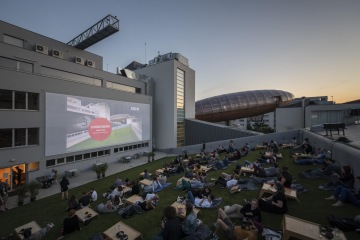 Summer movie nights on a grassy roof in the middle of the city. Films that you won’t see just anywhere. A big movie screen, clear sound in headphones, and refreshing drinks. That’s the new Evergreen Summer Cinema, on the roof of the DOX+ multifunction hall.
