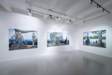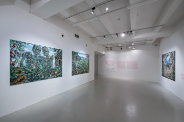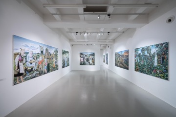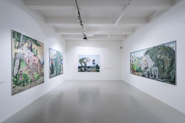 The exhibition The Ritual of Cursed Hearts presents the painting work of Jan Vytiska over the last three years. His last solo exhibition in Prague was six years ago. However recognizable and typical his paintings may appear at first sight, their form is undergoing a certain evolution. Vytiska is constantly experimenting, the colours of his paintings are changing, and their formats have gradually increased. Nor does the artist follow only one theme in his content. The exhibition presents almost forty large-scale paintings created by the artist after switching from acrylic to oil paint. Thematically, it is still based on a distinctive mix of Wallachian folklore and pop culture references. However, this is not a return to a tried-and-tested theme, but a new take on it and an expansion of its meaning. Landscapes appear more and more in recent paintings; mountain ranges or flowering meadows contrast with the scene they frame. Vytiska never ceases to mix all kinds of references with his own romantic gesture. In scope, The Ritual of Cursed Hearts exhibition is the artist’s largest project.