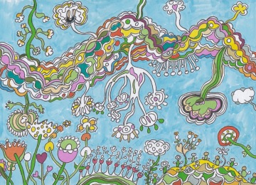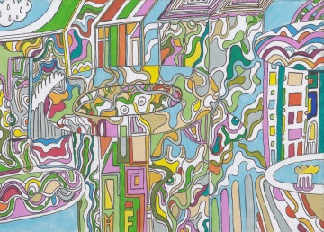 Veronika Zýková created several works for the Polička/Shelf gallery space, transferring her usually large-format abstractions onto the surface of children's picture books. In addition to abstractions created with spray paint, the exhibition also features colorful drawings made with markers. Veronika makes no secret of her admiration for painter and illustrator Stanislav Holý, whose work inspires her drawings. The exhibition also includes her poems and comic strips, whose heroes, simple geometric shapes, deal with complex human situations.
