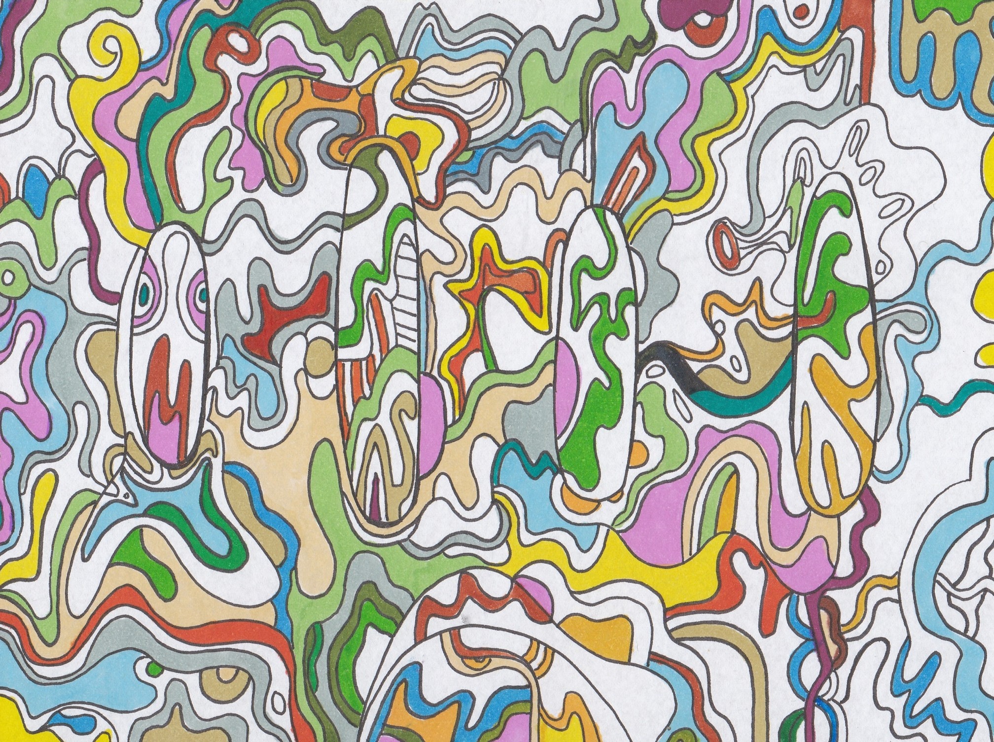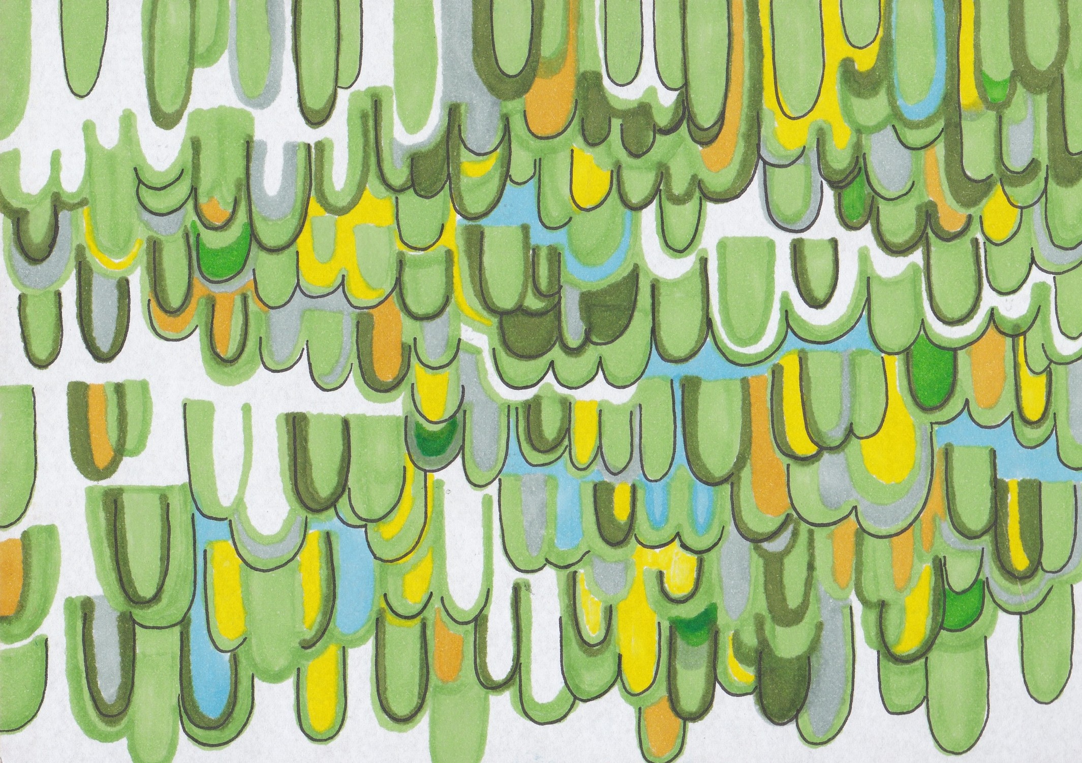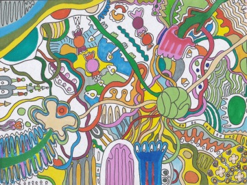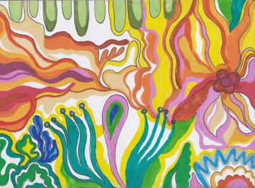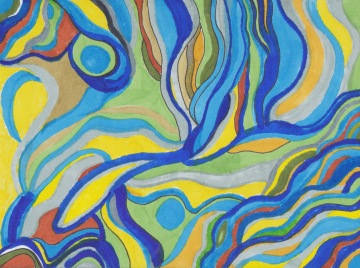 The author most often works with acrylic paints, sprays and markers, which she applies to the backs of posters and papers intended primarily for recycling. She describes her creative process as calming, with therapeutic significance, guided mainly by her current personal state of mind and methodical work with randomness and imperfections. In her words, the result of her work is often unpredictable.