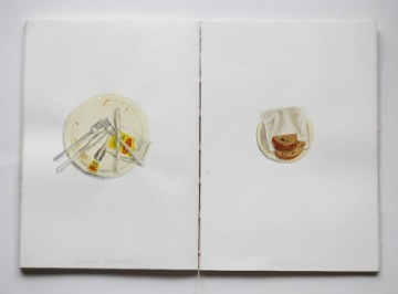 Manipulovaný skicák a transformovaný deník jsou jedněmi z mnoha podob autorské knihy. Eva Maceková zachycuje svými akvarely vyjedených talířů holou skutečnost. Podobně jako Ed Ruscha jen vyjímá a sbírá. Druhý sešit v bravurní kresbě dokumentuje sbírku fotografických aktů. Oba tyto skicáky jsou nedokončené. Jako jedny z mála neobsahují příběhy, pády. Jsou lyrické. A i taková umí být Eva Maceková.